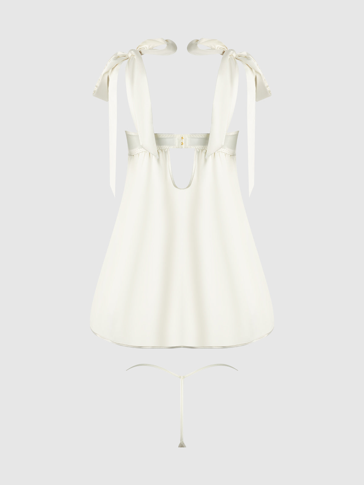 Tie, tease, and tantalize in the Rosalie Babydoll. This flattering empire-cut silhouette features a low-cut neckline, crafted from stretch satin and adorned with sheer lace cups. Complete the look with the matching G-string. Release the shoulder ties and let pure desire unfold. Ready to be unwrapped?